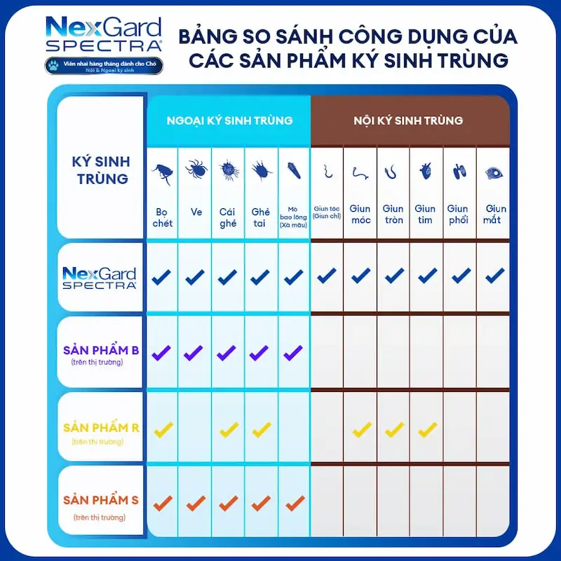 | Tính năng so sánh | NexGard Spectra (Viên nhai) | Thuốc nhỏ gáy truyền thống | Viên nhai/Viên nén đơn lẻ (Chỉ trị ngoại KST) |